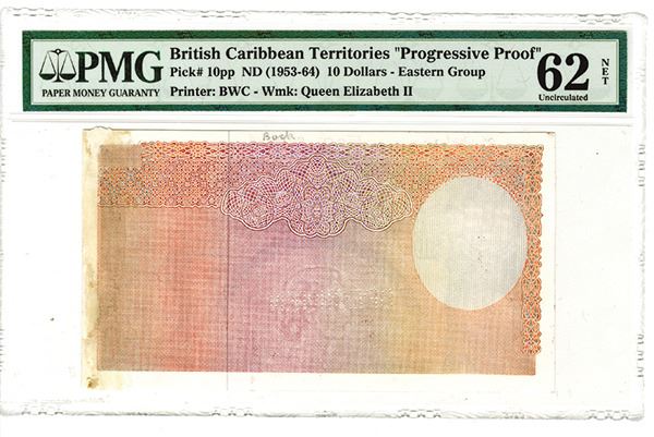 British Caribbean Territories. Eastern Group. Progressive Proof 10 Dollars with partial obverse and full reverse, ND (1953-1964), P-10pp, Queen Elizabeth II watermark, PMG Uncirculated 62 NET with Printer's Annotations and Previously Mounted. BWC.
