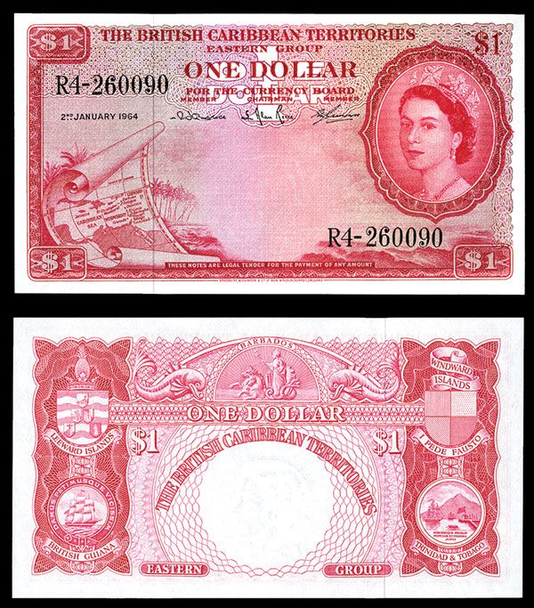 BCT, 2nd January 1964, $1, P-8c, issued banknote, red on m/c with Queen Elizabeth II watermark, Serial numbers R4-260090, Choice + to Gem Uncirculated condition. This is also the Pick Plate note in the SCWPM. BWC.