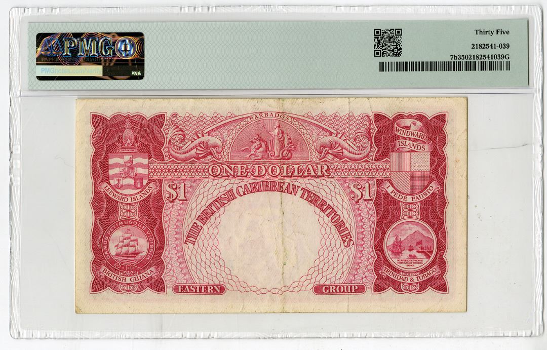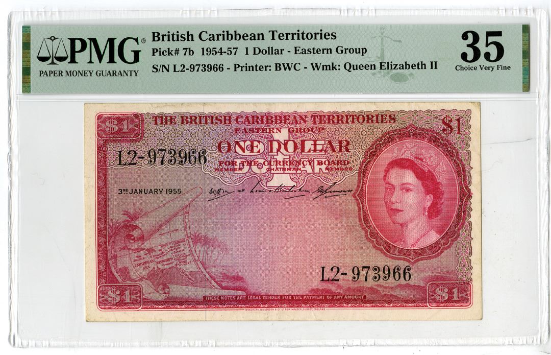 British Caribbean Territories, 3rd January, 1955. $1, P-7b, Issued Banknote, Red on m/c underprint, Map at lower left and portrait of Queen Elizabeth II at right, S/N L2-973966, PMG graded Choice Very Fine 35, Printer: BWC.