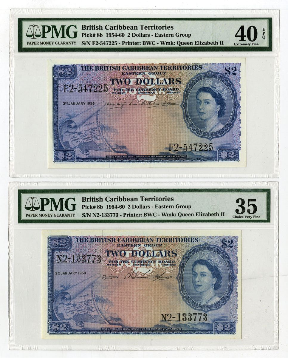 British Caribbean Territories, 1956 and 1959. 2 Dollars, P-8b (2), Lot of 2 Issued Banknotes, Blue on m/c underprint, Map at lower left with portrait of Queen Elizabeth II at right, Back has arms in all four corners, S/Ns F2-547225 & N2-133773, Both are PMG graded: First is Extremely Fine 40 EPQ and the Second is Choice Very Fine 35, BWC. (2). Sold "AS IS" no returns accepted.