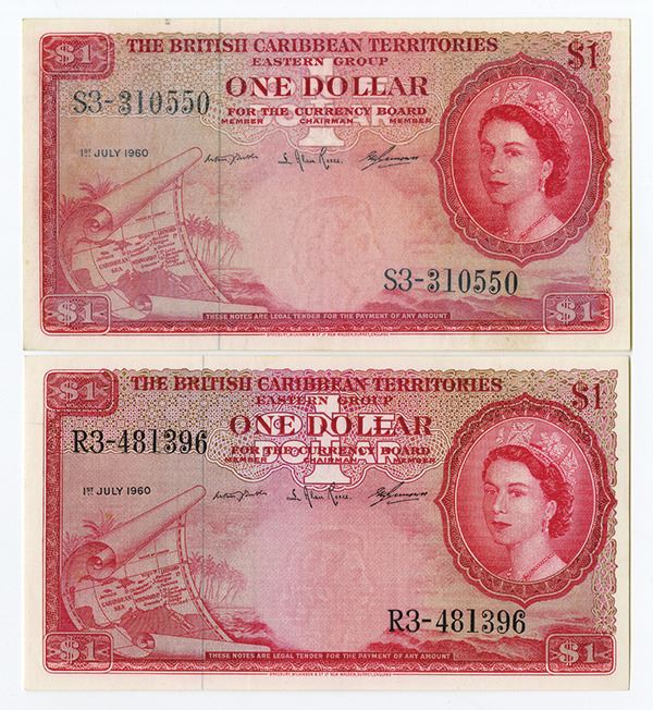 BCA... Lot of 2 notes, Both are $1, P-7c, Choice XF to AU, Red with Queen Elizabeth II at right. BW&C.