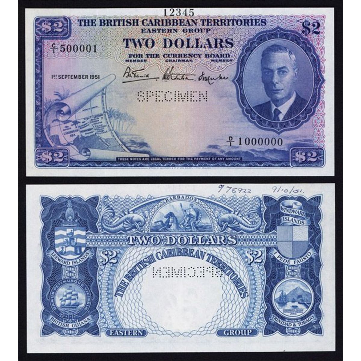 British Caribbean Territories, 1st September 1951, $, P-2s, Specimen banknote, Blue on m/c with King George VI on right and map on scroll on left, back red. Pin punch specimen in middle and 12345 on top margin, S/N D/1 000000, Choice Uncirculated Condition with archival hand written numbers on the top back middle margin with date 9/10/51. Attractive and rare as specimen. BWC.