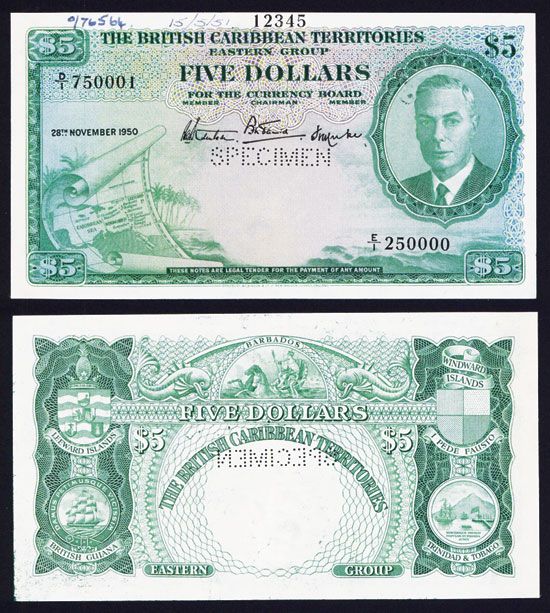 British Caribbean Territories, 28th November 1950, $5, P-3s, Specimen banknote, Green on m/c with King George VI on right and map on scroll on left, back red. Pin punch specimen in middle and 12345 on top margin, S/N E/1 250000, Choice Uncirculated Condition with archival hand written numbers on the top middle margin and hand written date 15/5/51. Attractive and scarce. BWC.