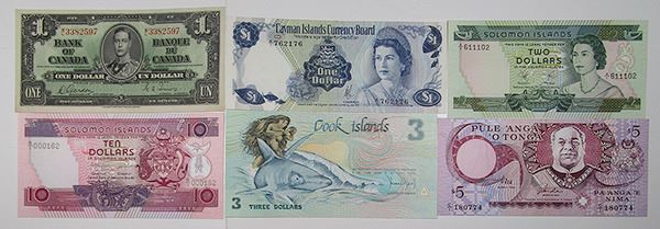 Canada, Cayman Islands, Cook Islands, Falkland Islands, St. Helena, Samoa, Solomon Islands, & Tonga.... Lot includes a Canada KGVI issue 1 Dollar 1937, P-58; Cayman Islands 1 Dollar, P-1a & 5e; Cook Islands 3 Dollars, P-3; Falkland Islands 5 Pounds, P-12; St. Helena 1 Pound, P-6; Samoa 2 Tala, P-25; Western Samoa 1 Tala, P-16d; Solomon Islands 2, 5, and 10 Dollars, P-5, 13, 14, & 15; and Tonga 5 Pa'anga, P-33. VF to Unc. (13)