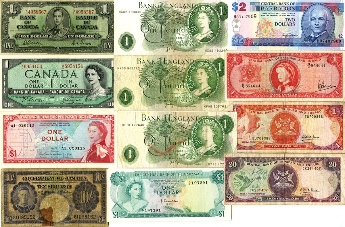 British Colonies, 1937 to ND (1985). Lot of 12 Issued Banknotes from Various Current and Former British Colonies. Includes: Bank of Canada, 1937, 1 Dollar, P-58d, CBNC; 1954 (1955-61), 1 Dollar, P-74a, CBNC; Government of Jamaica, 1958, 10 Shillings, P-39, TDLR; East Caribbean Currency Authority, ND (1965), 1 Dollar, P-13a, TDLR; Central Bank of Trinidad and Tobago, L.1964, 1 Dollar, P-26c; ND (1985), 1 Dollar, P-36b; ND (1985), 20 Dollars, P-39b; Bank of England, ND (1966-70), 1 Pound, P-374e (3); Central Bank of the Bahamas, L.1974, 1 Dollar, P-35a, TDLR; Central Bank of Barbados, ND (1980), 2 Dollars, P-30a, TDLR. Notes range from Fine to Uncirculated condition. (12). Sold "AS IS" no returns accepted.