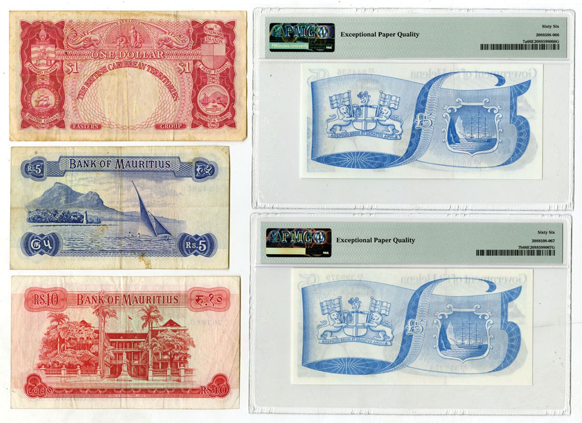 British Caribbean Territories, Mauritius, Saint Helena, 1961 to 1981. Lot of 5 Issued Banknotes, Includes: British Caribbean Territories, Eastern Group, $1, P-7c, S/N S3-938000, BWC; Bank of Mauritius 5 Rupees, P-30b, S/N A/17 349826, TDLR; 10 Rupees, P-31a, S/N A/8 767666; Government of St. Helena £5, P-7a & P-7b, S/Ns H/1 044536 & H/1 399379, Both are PMG graded Gem Unc 66 EPQ. Ungraded notes range from Fine to VF+ condition. (5). Sold "AS IS" no returns accepted.