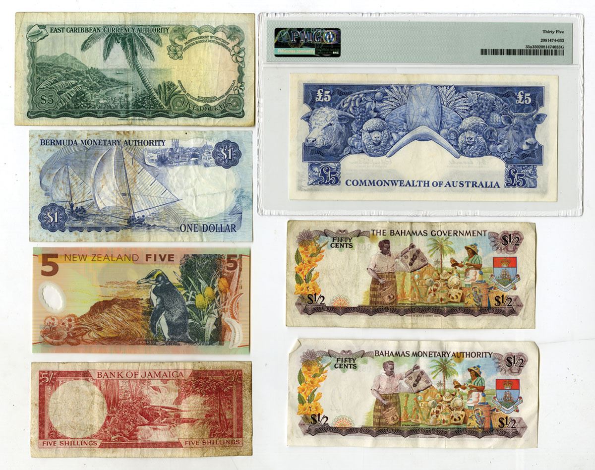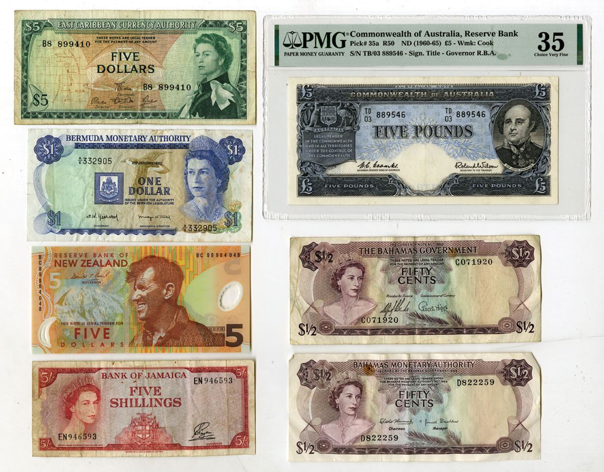 Jamaica, Bahamas, Bermuda, East Caribbean States, New Zealand, & Australia, ND (1960-65) to 1999. Lot of 7 Issued Banknotes, Includes: Bank of Jamaica, 1964. 5 Shillings, P-51Ab, VF; Bahamas Monetary Authority, 50 Cents, 1965, P-17a and 50 Cents, 1982, P-26a, Both VF; East Caribbean Currency Authority, ND (1965). $5, P-14e, VF; Reserve Bank of New Zealand, 1999. $5, P-185a, Choice AU; and, Reserve Bank of Australia, ND (1960-65). £5, P-35a, PMG CH VF 35. Notes are Fine-AU condition. (7). Sold "AS IS" no returns accepted.