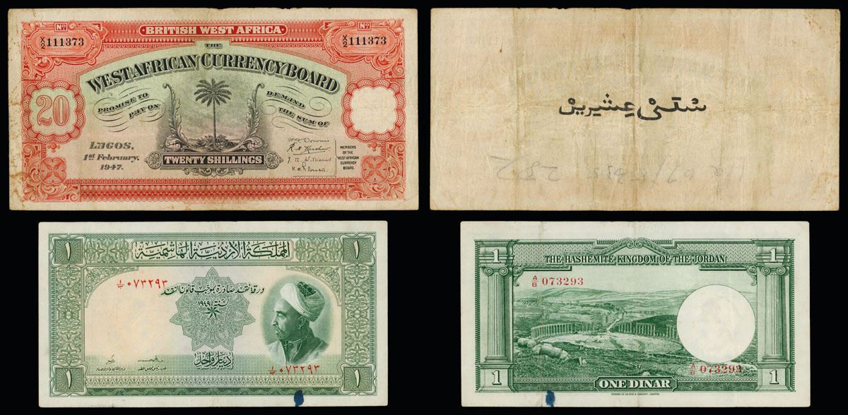 Jordan 1949 1 Dinar P-2a, VF condition with an ink stain on the lower margin, scarce note in any condition; and British West Africa 1947 20sh, VF condition; both attractive notes for the grade.