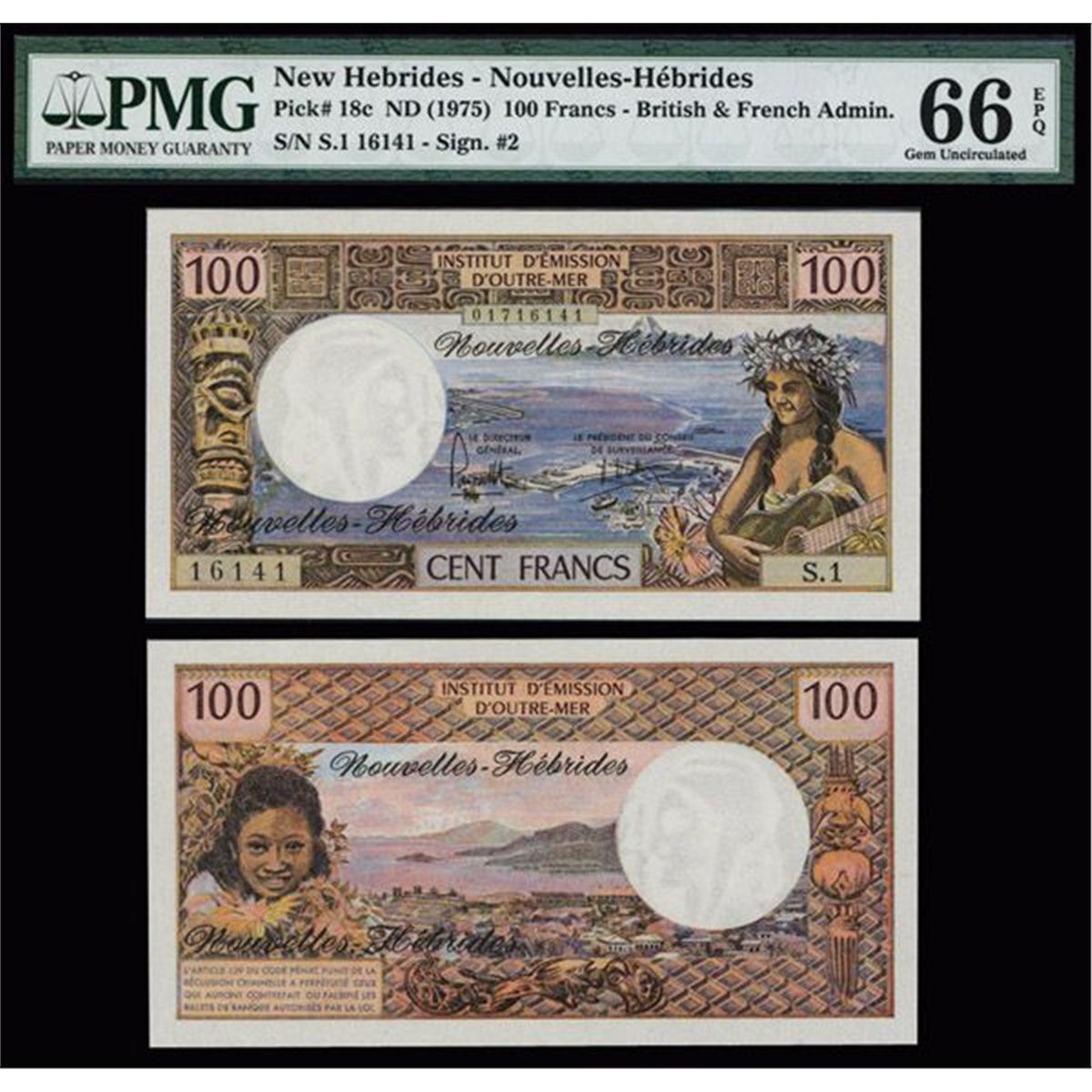 New Hebrides, ND (1975), 100 Francs, P-18c, British & French Administration, Signature 2, Woman playing guitar on right overlooking harbor scene on face, back with young woman with island view, PMG graded Gem Uncirculated 66 EPQ (Exceptional Paper Quality), Scarce note in exceptional grade that will be hard to improve upon.