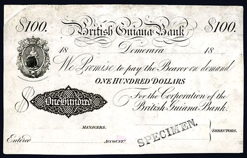 Demerara, British Guiana. 18xx (ca.1860-1890's). $100. P-Unlisted?, Proof impression printed on white paper with Specimen overprint. Seated allegorical woman on left. AU condition with small repair on UL corner and evidence of handling. Printed by Perkins, Bacon & Co. Rare note and possibly unique. “East Bay Collection”.