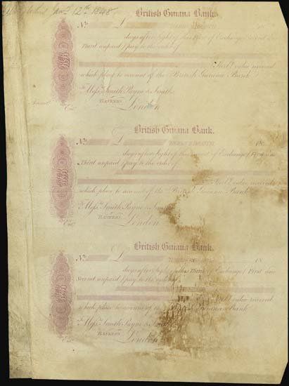 18--. (1848 written on top margin). Berbice Branch, British Guiana. Uncut sheet of 3 proof 1st, 2nd and 3rd Bills of Exchange printed in maroon. Correspondent bank in London, England. Printed onthick india type of paper. All have counterfoil with bank name on left in ornate letters. Condition varies between VG to Fine condition with minor toning, wrinkling, water staining and light glue stains. Printed by Perkins, Bacon & Co., London. PBC.Rare location for early fiscal paper.