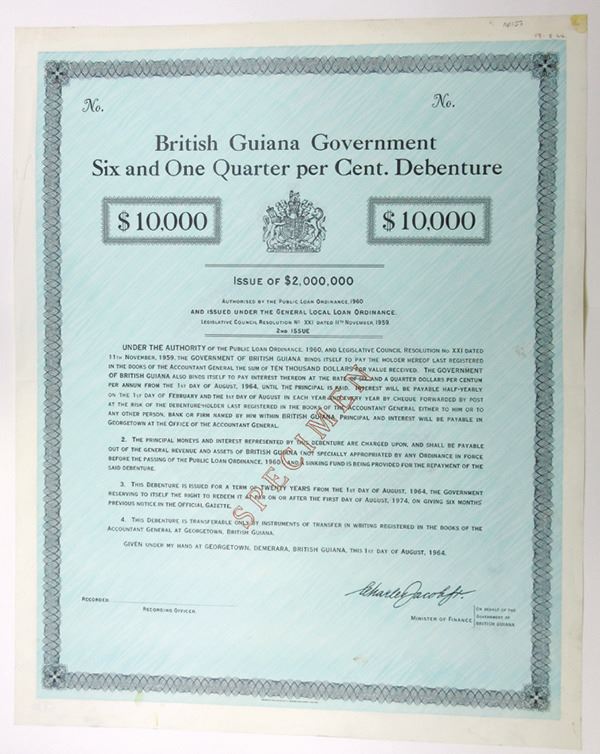Guiana. $10,000 Specimen 6 1/4% Debenture Bond, Black print on simple black border with blue under tint large sized format, VF-XF condition with small stains at bottom, Bradbury, Wilkinson & Co.
