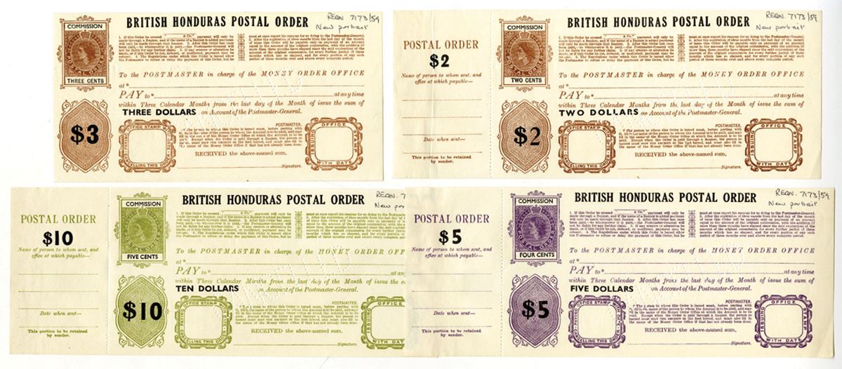 British Honduras, 1959, Lot of 4 different denomination Postal Money Orders, all with Imprinted "Commission" Revenue Stamps with Queen Elizabeth II's portrait on them in different denominations, Includes: $2, Postal Money Order with 2 Cents Revenue Stamp in brown; $3, Postal Money Order with 3 Cents Revenue Stamp in red-brown; $5, Postal Money Order with 4 Cents Revenue Stamp in purple; and, $10, Postal Money Order with 5 Cents Revenue Stamp in gray, All are pin-punched "Cancelled" diagonally in middle with archival notations in ink on the top right corner with dates and description of revenue stamps "New Portrait". All but the $3 have a counterfoil on the left. All are in Uncirculated condition. Rare Specimen Postal Money orders. No printer noted, (4)