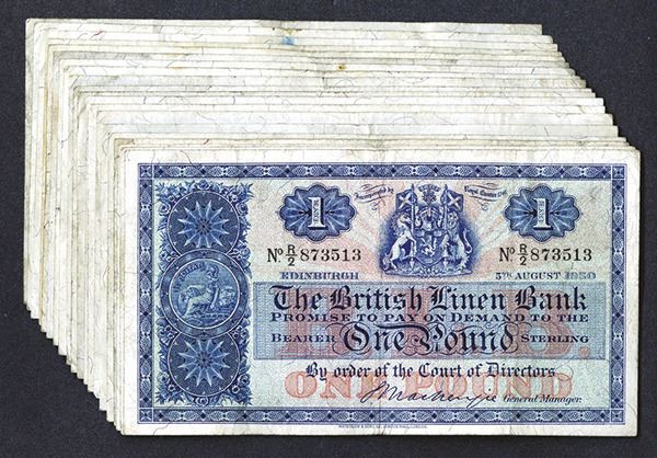 Scotland. 1 Pound. SCWPM 157c (16); d (4). Nice bold design. Generally Very Good-Fine, some with ink marks. 20 pieces.