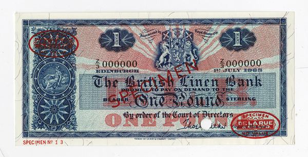 Scotland. 1963, 1 Pound, P-166cs, Specimen Banknote, TDLR, Specimen No 13. Unc with mounting traces on reverse. (Hammurabi Collection of Serial #13 Notes)