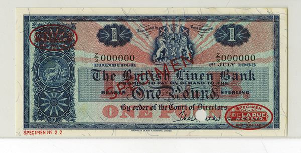 Scotland. 1963, 1 Pound, P-166s, Specimen Banknote, Specimen and Oval TDLR overprints on top left and lower right corners, Minor Mounting remnants on back right margin that is difficult to view. PCGS graded Very Choice New 64, POC, TDLR.