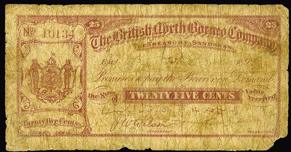 British North Borneo, 1897, 25 cents, P-1, Issued banknote, Brown with arms at left, back blank, S/N 10134, VG to Choice VG with a small piece of the lower right corner tip missing. Rare not in any condition and first time this variety has been offered by us.