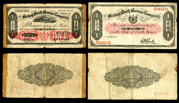British North Borneo, 1936-40, pair of 1 Dollar Issued notes, P-28 and P-29. The 1 Dollar 1936 is VG condition with tape on the left and right edges, the 1 Dollar 1940 is Choice Fine. Printer: Blades, East & Blades, Ltd.