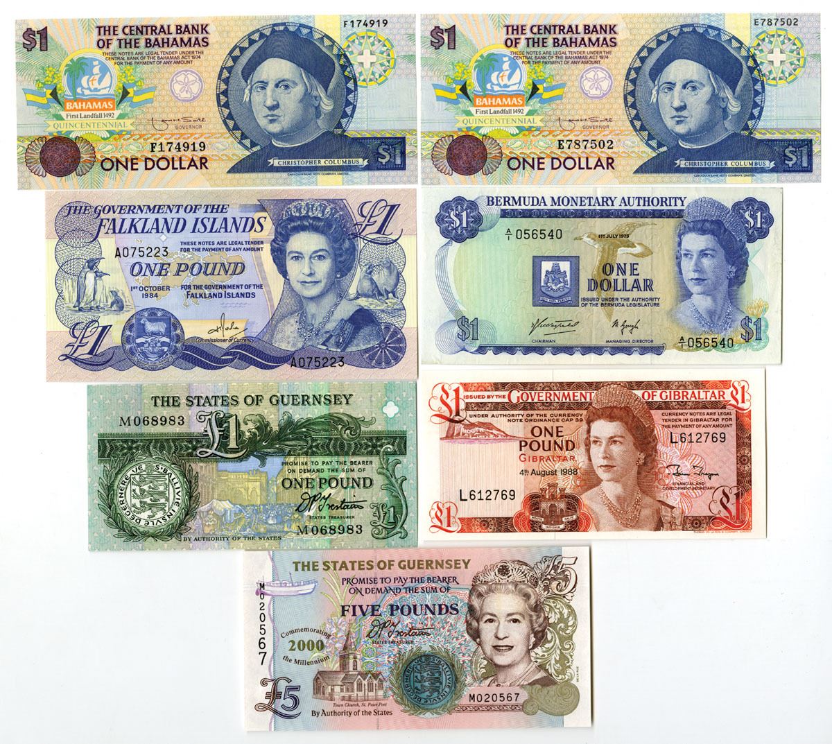 World Wide, 1975-2000. Lot of 7 Issued Banknotes from former and current British Territories, Includes: Central Bank of the Bahamas - Commemorative Issue, ND (1992), 1 Dollar, P-50a (2), CBNC; Bermuda Monetary Authority, 1975, 1 Dollar, P-28a; Government of the Falkland Islands, 1984, 1 Pound, P-13a; Government of Gibraltar, 1988, 1 Pound, P-20e, TDLR; States of Guernsey, ND (1991-95), 1 Pound, P-52b, TDLR; 2000, 5 Pounds, P-60, DLR. Notes are in UNC to Gem UNC condition. (7). Sold "AS IS" no returns accepted.