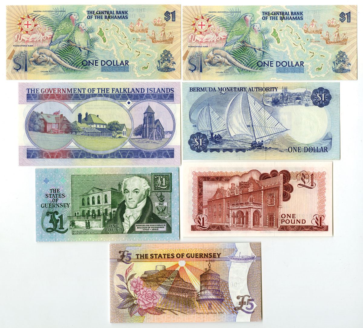 World Wide, 1975-2000. Lot of 7 Issued Banknotes from former and current British Territories, Includes: Central Bank of the Bahamas - Commemorative Issue, ND (1992), 1 Dollar, P-50a (2), CBNC; Bermuda Monetary Authority, 1975, 1 Dollar, P-28a; Government of the Falkland Islands, 1984, 1 Pound, P-13a; Government of Gibraltar, 1988, 1 Pound, P-20e, TDLR; States of Guernsey, ND (1991-95), 1 Pound, P-52b, TDLR; 2000, 5 Pounds, P-60, DLR. Notes are in UNC to Gem UNC condition. (7). Sold "AS IS" no returns accepted.