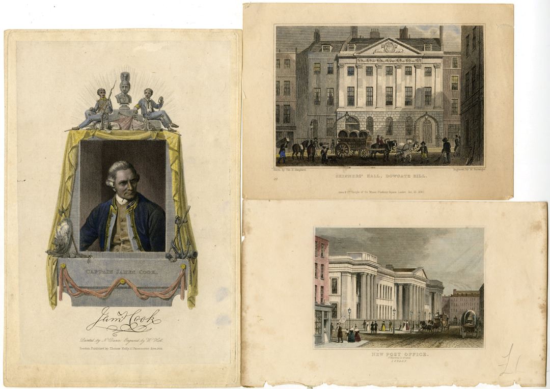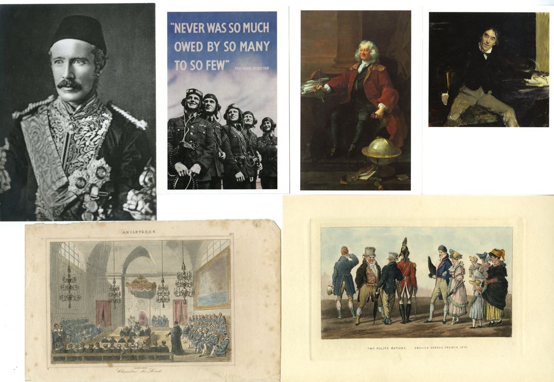 England & France.... Over 25 pieces of early prints and engravings from Britain and France. Highlights include: Reproduction of a photograph of Charles George Gordon in Egyptian uniform; British postcard 'Never Was So Much Owed By So Many To So Few,' taken from a WWII poster; Card from the National Portrait Gallery, featuring a portrait of Sir Henry Irving (1838-1905); "Two Polite Nations: English versus French, 1814" colorful engraving; Small page featuring illustrations of New Gresham St. on top, and Merchant Tailor's Hall on bottom, both in London; Various other illustrated pages of locations in London, such as the Chamber of the Lords and Skinners' Hall; Reproduced likenesses of Dorothea Jordan, an Anglo-Irish actress, courtesan and mistress; Colored illustration of the Coronation Chair in Westminster Abbey; "Catherine of France Presented to Henry V of England" illustration; and a Mounted Illustration of "The Author of the Wealth of Nations" Adam Smith. Very colorful and interesting lot of illustrations and engravings. (25+)