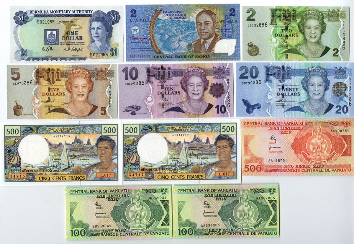 Fiji, Bermuda, French Pacific Territories. Lot of 11 Former British or French Colonial Territories, Includes: Bermuda Monetary Authority, 1988, 1 Dollar, P-28d; Central Bank of Samoa, ND (1990) 2 Tala, P-31d, NPA; Instiut d'Emission d'Outre-Mer, ND (1992), 500 Francs, P-1b (2); Reserve Bank of Fiji, ND (2007;2012), 2 Dollars, P-109b, TDLR; 5 Dollars, P-110a, TDLR; 10 Dollars, P-111b, TDLR; 20 Dollars, P-112a, TDLR; Central Bank of Vanuatu, ND (1982), 100 Vatu, P-1a (2), BWC; 500 Vatu, P-2a, BWC. Notes range from AU to UNC or better condition. (11). Sold "AS IS" no returns accepted.