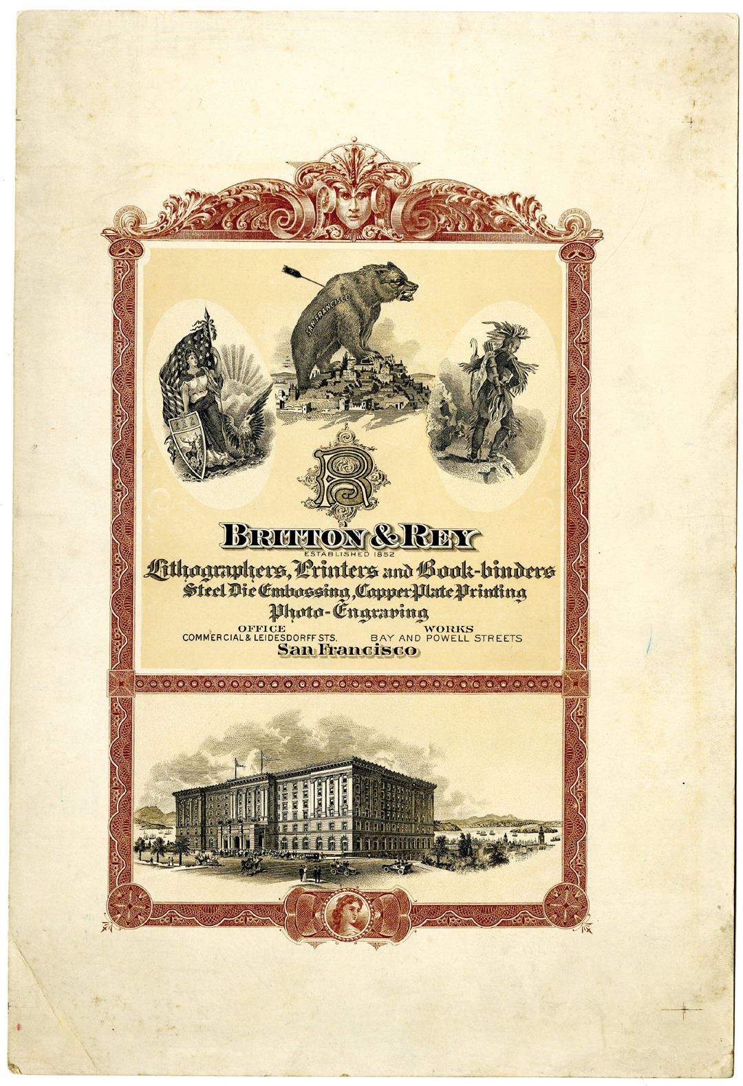 California, ca. 1900-1920s. Proof Advertising Sheet from Britton & Rey printed on off-white cardstock. Black text with brown border, tan background at top with California bear at center, flanked by allegorical woman with flag and shield at left, and an allegorical Native American at right, Bottom features a large building with body of water in background. Britton & Rey, according to this piece, were lithographers, printers, and book-binders, and were located in San Francisco, California. VF condition with toning.