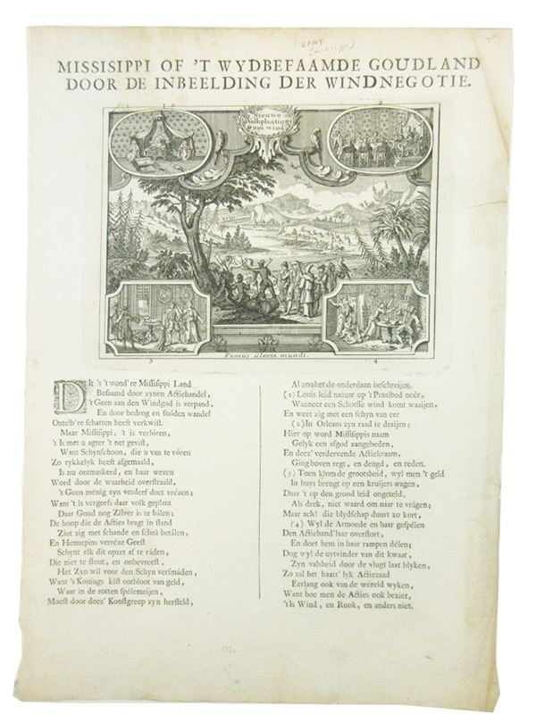 Amsterdam, Netherlands. MISSISSIPPI OF ÔT WYDEFAAMDE GOUDLAND DOOR DE INBEELDING, Amsterdam, 1720. 10Ó x 15Ó. Dutch text. Underneath the title, a well-executed woodcut depicts an artistÕs conception of the Mississippi River Valley. There is a vertical fold, and a short repaired edge split, otherwise generally Very Fine. From a Dutch collection of broadsides entitled HET GROOTE TAFEREEL DER DWAASHEID (The Great Mirror of Folly). Like the South Seas Company, John LawÕs Mississippi Company was a speculative land scheme that promised an investment in a virtual paradise, but delivered little or nothing for most investors. (John E. Herzog Collection)