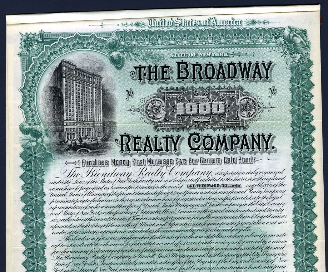 New York, NY, 1896, $1000, Specimen Bond, 5% Gold Bond, Large office building on top left, black with green border and underprint, Early New York Real Estate related bond, POC's, Coupons attached, XF condition, Franklin BNC.