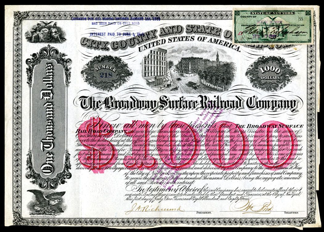Lot of 19, All are $1000, 5% Mortgage Bonds without coupons, attractive red underprint with large view of New York City horse drawn railroad cars with buildings. All are partially redeemed and not fully cancelled. Arthur Brown, NY.