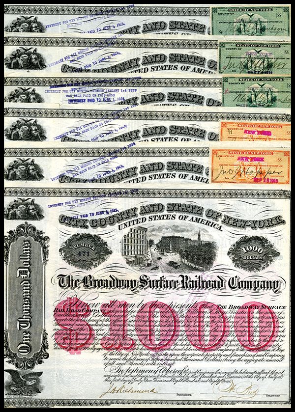 Broadway Surface Railroad Company $1,000 Bonds, Lot of Six 1884. NY. Red $1000. Horse drawn streetcar rounds Bowling Green. Mostly VF+, with minor edge roughness. (6)