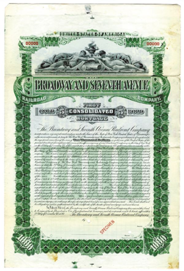 New York. $1000 Specimen 5% 1st Consolidated Mortgage Gold Bond, Black print on large green border and under tint, Nude allegorical figures reclining at top, Specimen overprints and POC's, Fine condition with splitting and toning along fold lines, IBNC.