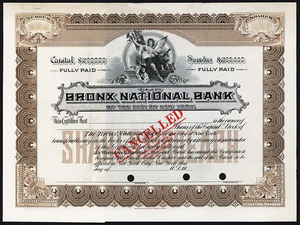 Bronx, New York. Odd Shares, Specimen Capitol Stock Certificate. Black print with light brown border and under print. Vignette of an allegorical woman holding a horn at top center of certificate. Cancelled overprint, POC's, XF condition, SBNC.