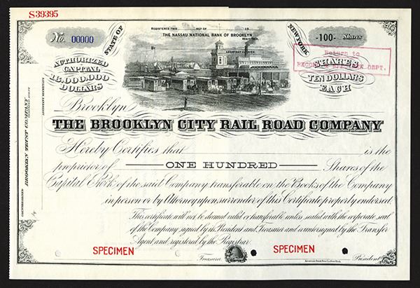 Brooklyn, N.Y., 100 Shares, Specimen stock, Black with no underprint, Detailed vignette of horse drawn street cars at station with harbor scene in background, Specimen overprints, POC's, VF-XF. Rare and attractive stock certificate, ABNC.