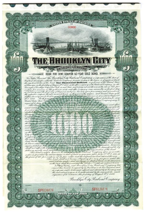 New York. $1000 Specimen 4% Gold Coupon Bond, Black print on green border and under tint, View of Brooklyn Bridge at top, Specimen overprints and POC's, Fine-VF condition, ABNC.
