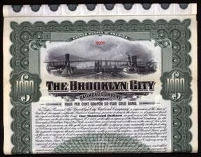New York, 1906, $1000. 4% Coupon 50-Year Gold Bond. Green border with Brooklyn bridge and busy harbor scene. ABNC. Specimen w/coupons, XF. Rare and unlisted railroad bond in Cox with only a single stock certificate mentioned for this name. Attractive view of the Brooklyn bridge.