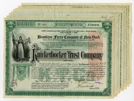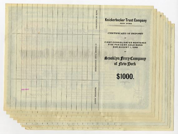 New York...., 1906-07. $1000 I/U 5% First Consolidated Mortgage Gold Bonds (8), Black on green border and underprint, Allegorical woman at top left corner, Trust was made in to accommodate the Brooklyn Ferry Co. of New York, All are in VF condition, ABNC. (8). Sold "AS IS" no returns accepted. (ex. John E. Herzog Collection)