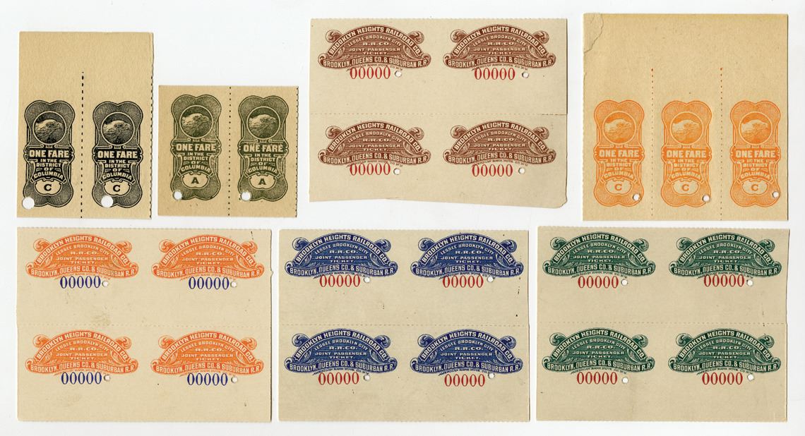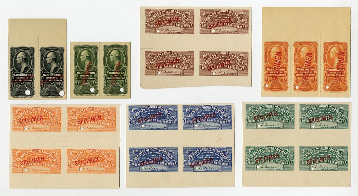 New York and Washington, D.C., ND (ca.1880s). Lot of 23 Specimen Tickets, Includes Brooklyn Heights Railroad Co., 4 blocks of 4 Specimen Passenger Tickets in varying colors, imperforate vertically and with large gutters horizontally (16 specimen tickets); and, Washington Railway & Electric Co., 2 uncut pairs and one strip of 3 Specimen Tickets in varying colors. All have POCs, Specimen overprints, are in Mint condition, printed by ABNC. (23 tickets total in lot)). Sold "AS IS" no returns accepted.