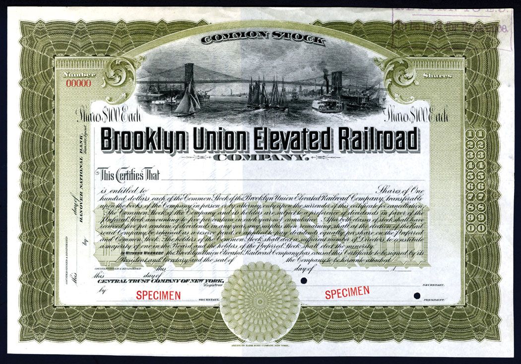 Brooklyn, New York. Odd Shares, Specimen stock certificate. View of Brooklyn Bridge with sailing ships and ferry's in busy harbor scene. Olive green Border. POC's. VF condition Scarce and popular stock certificate. ABNC.