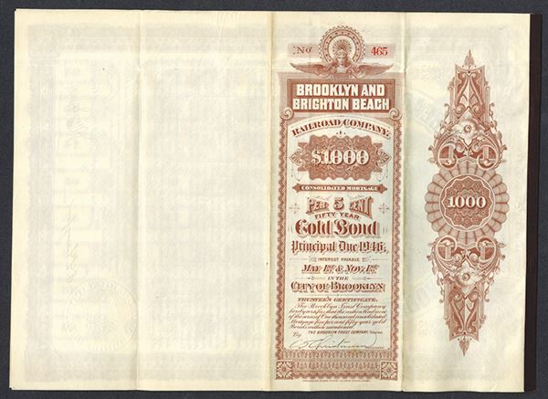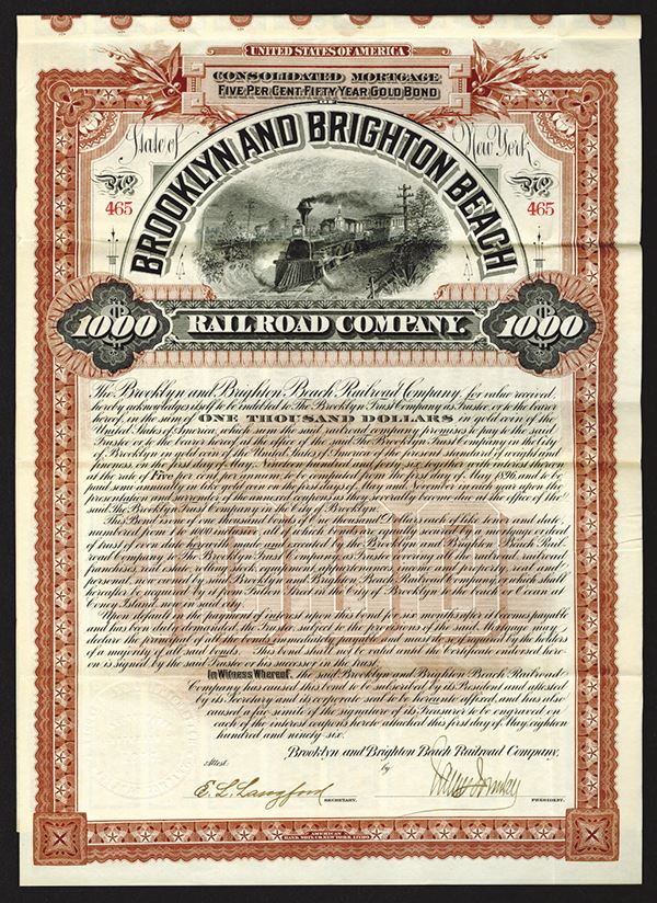 New York. 1896, $1000, Consolidated Mortgage 5% 50 Year Gold Coupon Bons, brown border and underprint with locomotive passing telegraph poles and countryside under arched title, Choice Fine to VF condition. ABNC.