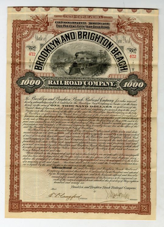New York, 1896. $1000 I/U 5% Consolidated Mortgage Fifty Year Gold Coupon Bond, Black on brown border and underprint, Locomotive passing telegraph poles at top center under curved title, S/N 472, XF condition, ABNC. (ex. John E. Herzog Collection)
