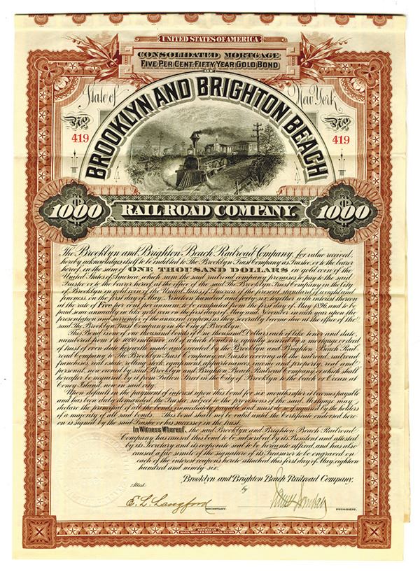 New York. $1000 Issued 5% Consolidated Mortgage Gold Coupon Bond, Black print on red/brown border and under tint, Locomotive moving down tracks at top under company title, VF-XF condition, ABNC.