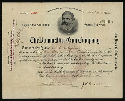 Maine, 1907, I/U Stock, 1000 Shares, #2568, Black print with no border and vignette top center of a gentleman, VF condition, Clark & Zugalia.