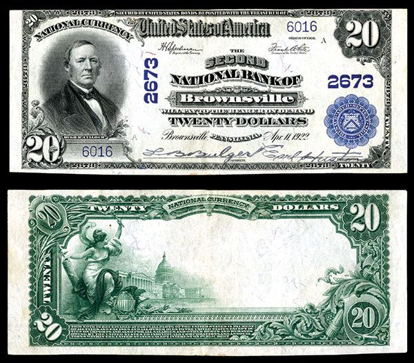 Second National Bank of Brownsville, Pennsylvania, Speelman - White Signatures, Blue Seal, S/N 6016, pp A, PMG graded About Uncirculated 53 NET with note of minor rust that is difficult to locate, 13 Large and 3 Small size notes known on this bank, very attractive note with 3 large margins and cut close on top .