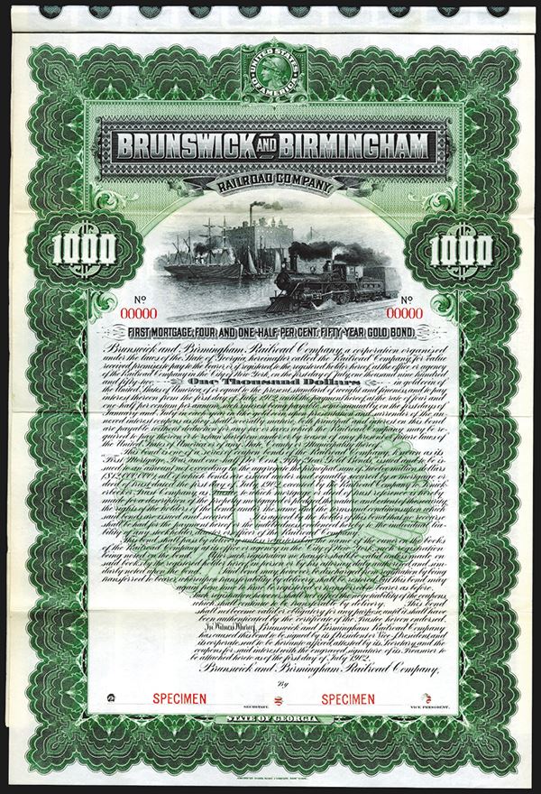 Georgia, 1902, $1000, Specimen 1st Mortgage 4 1/2% Gold Bond, Green border with locomotive and seaport vignette, Coupons attached, POC's, XF, ABNC.