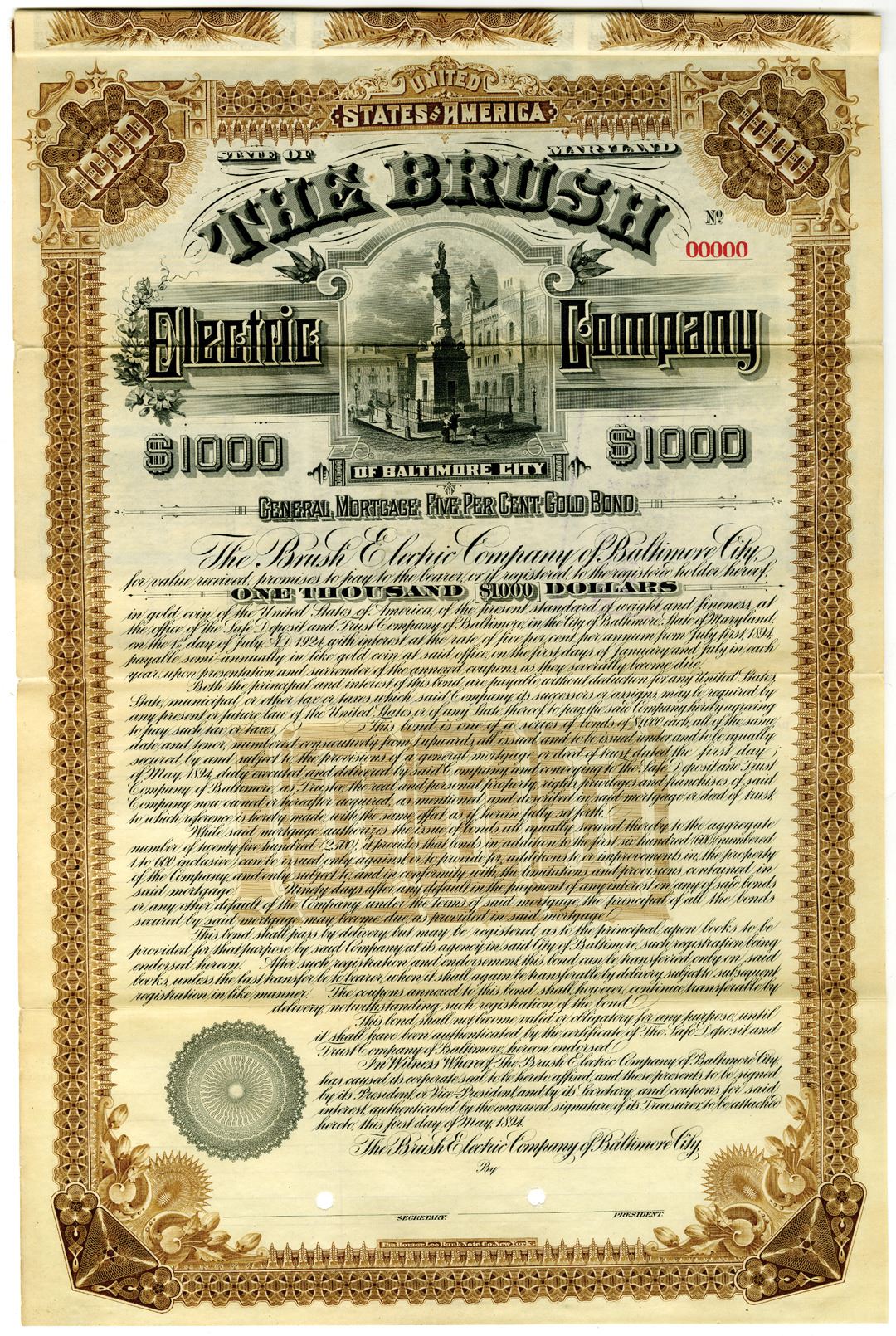 Maryland, 1894. $1000 Specimen 5% General Mortgage Gold Coupon Bond, Black text with brown border and underprint, Large statue at top center. 00000 serial number and POCs. Fine condition with fragile fold lines, HLBN.