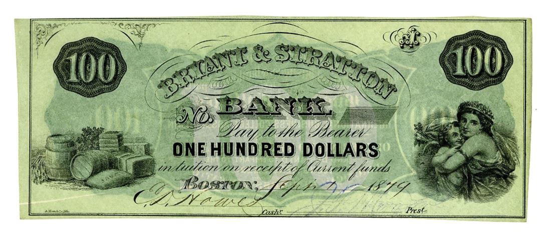 Boston, Massachusetts, 1879, $100, Ser.A., Issued College Currency Obsolete, no serial numbers, black on light green underprint, Cotton bales and barrels on left, allegorical woman and child on lower right, back green with information of college on back. AU/Uncirculated, Rare College currency variety. A. Hoen & Co., Lith.