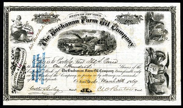 New York. 1869. 100 Shares I/U Stock. Black print with ornate black border and vignette of oil wells center. VF condition. W.W. Rose Lith. 25 cent orange revenue stamp center.