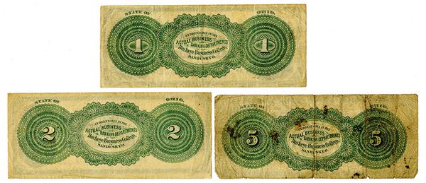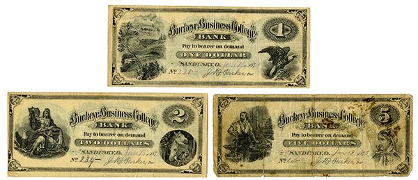 Ohio. Lot of 3 notes, Includes College Currency. 1, 2, 5 Dollar, 1873-74. First Two Fine, last is VG with stains. A scarce group of College Currency from Ohio. 3 pieces.