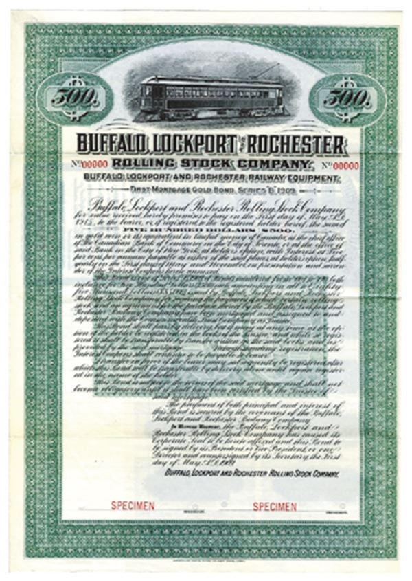 New York. $500 Specimen 5% Series B 1st Mortgage Gold Coupon Bond, Black print on green border and under tint, Electric street car at top in profile, Specimen overprints and POC's, VF-XF condition, ABNC.